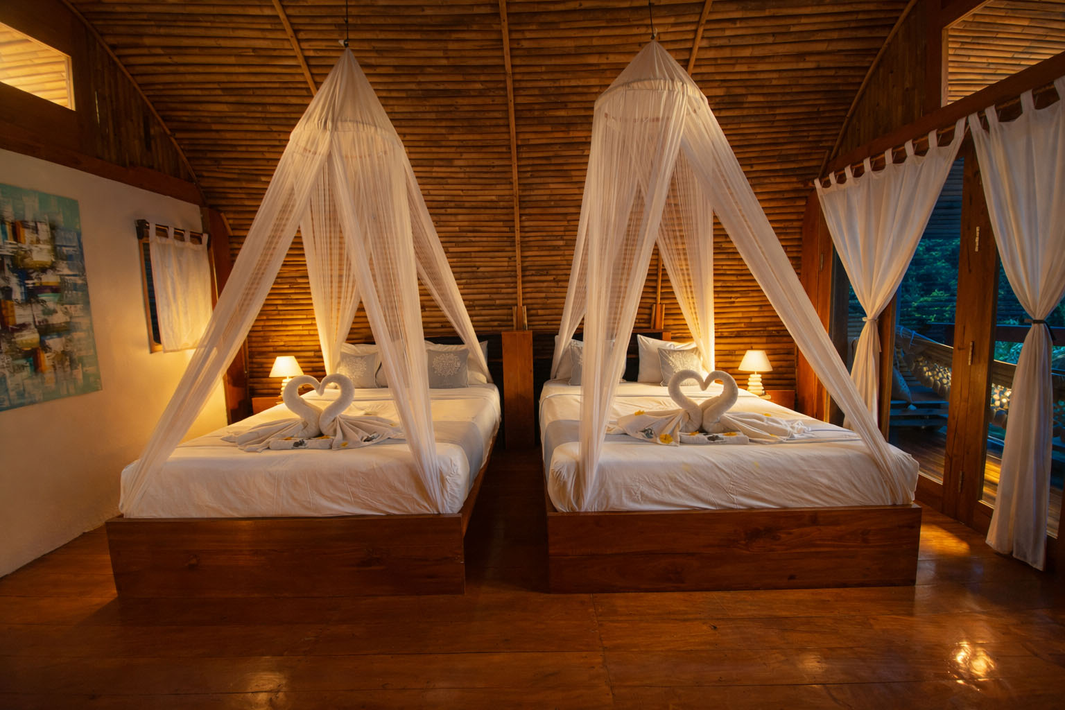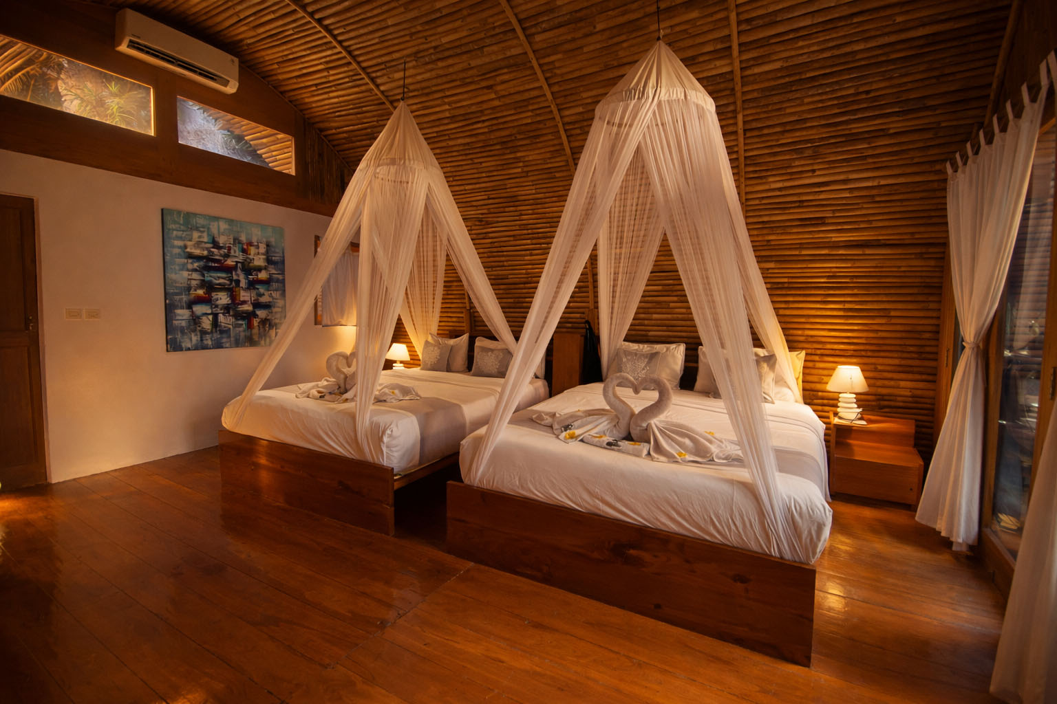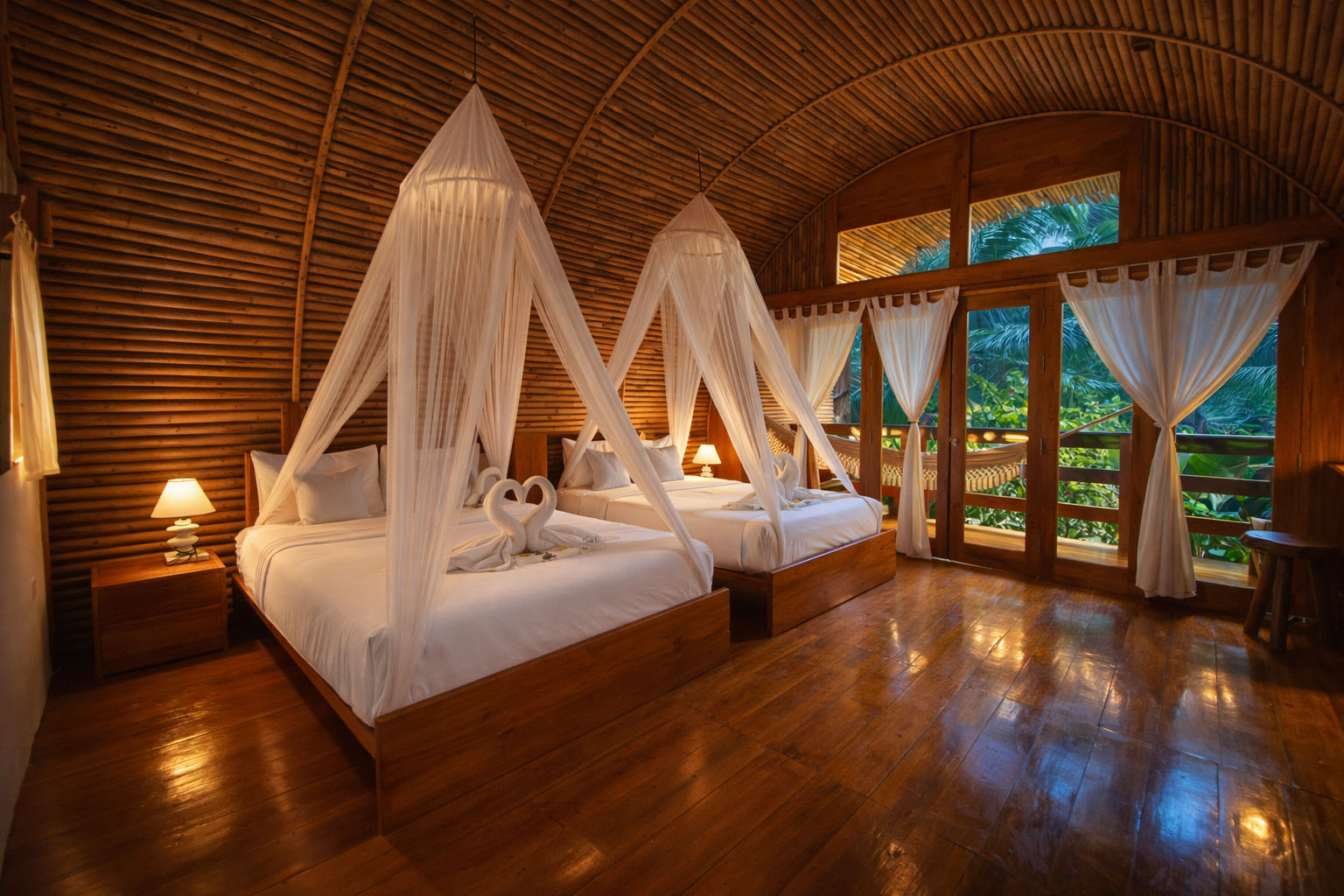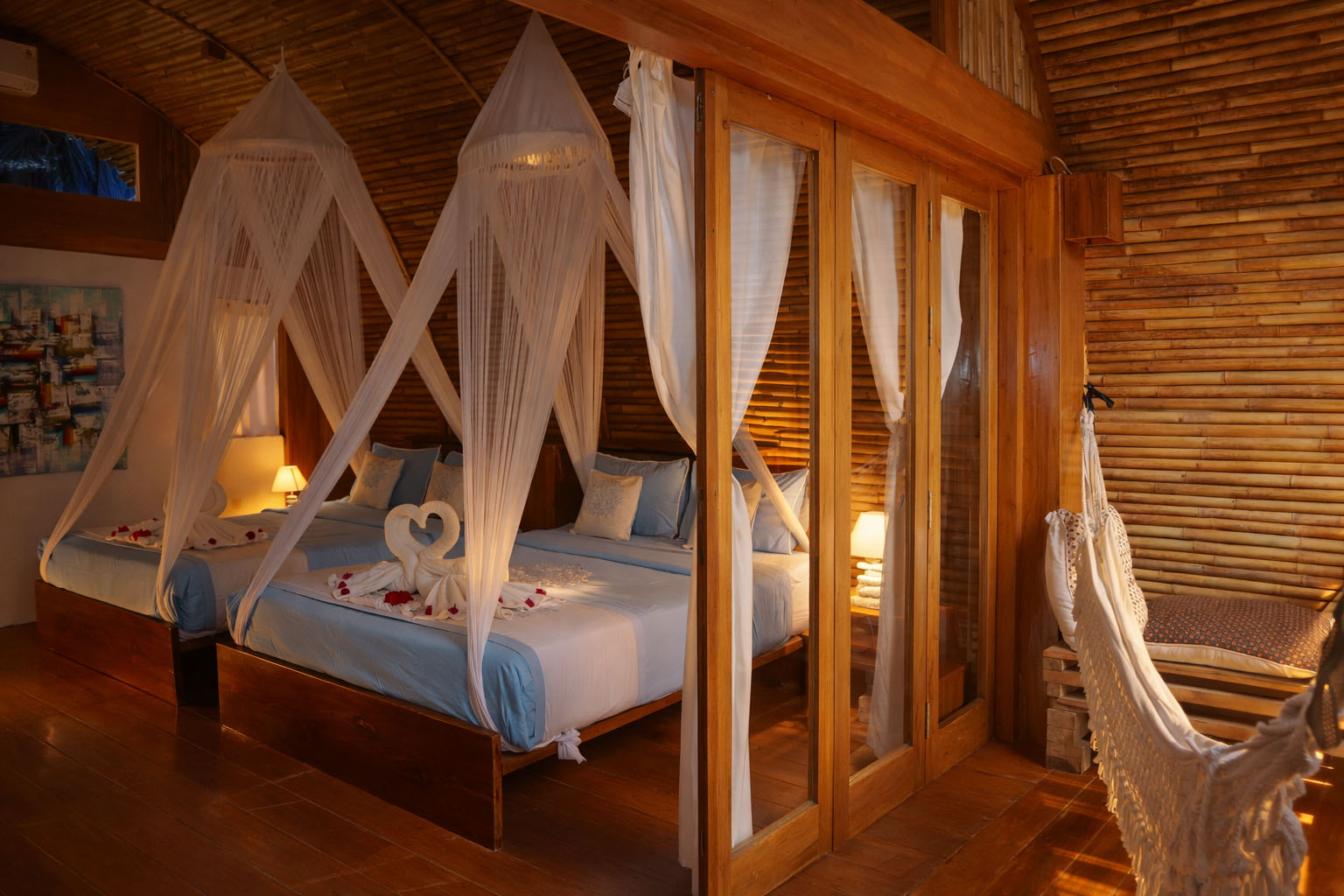 Badud Suite Family is a spacious and inviting bungalow designed to comfortably accommodate up to four guests. Featuring two queen-size beds, this suite offers generous space and privacy, making it an ideal choice for families or small groups seeking a relaxed and memorable stay. The suite boasts a wide, airy layout complemented by an aesthetic semi open-air bathroom crafted with natural elements, creating a refreshing and elegant bathing experience. A private balcony with a hammock invites guests to unwind while enjoying serene tropical surroundings. Blending authentic local design with modern comfort, the Badud Suite Family delivers a perfect balance of space, style, and tranquility.
