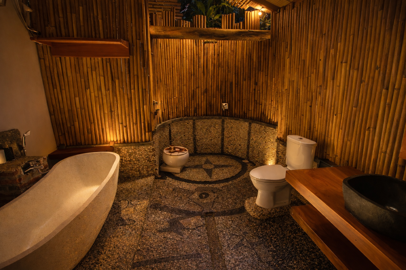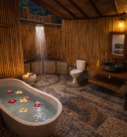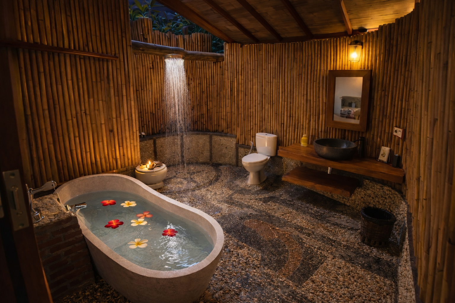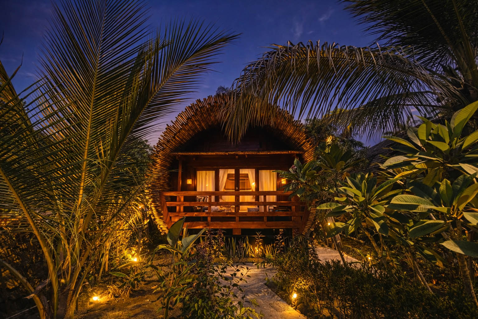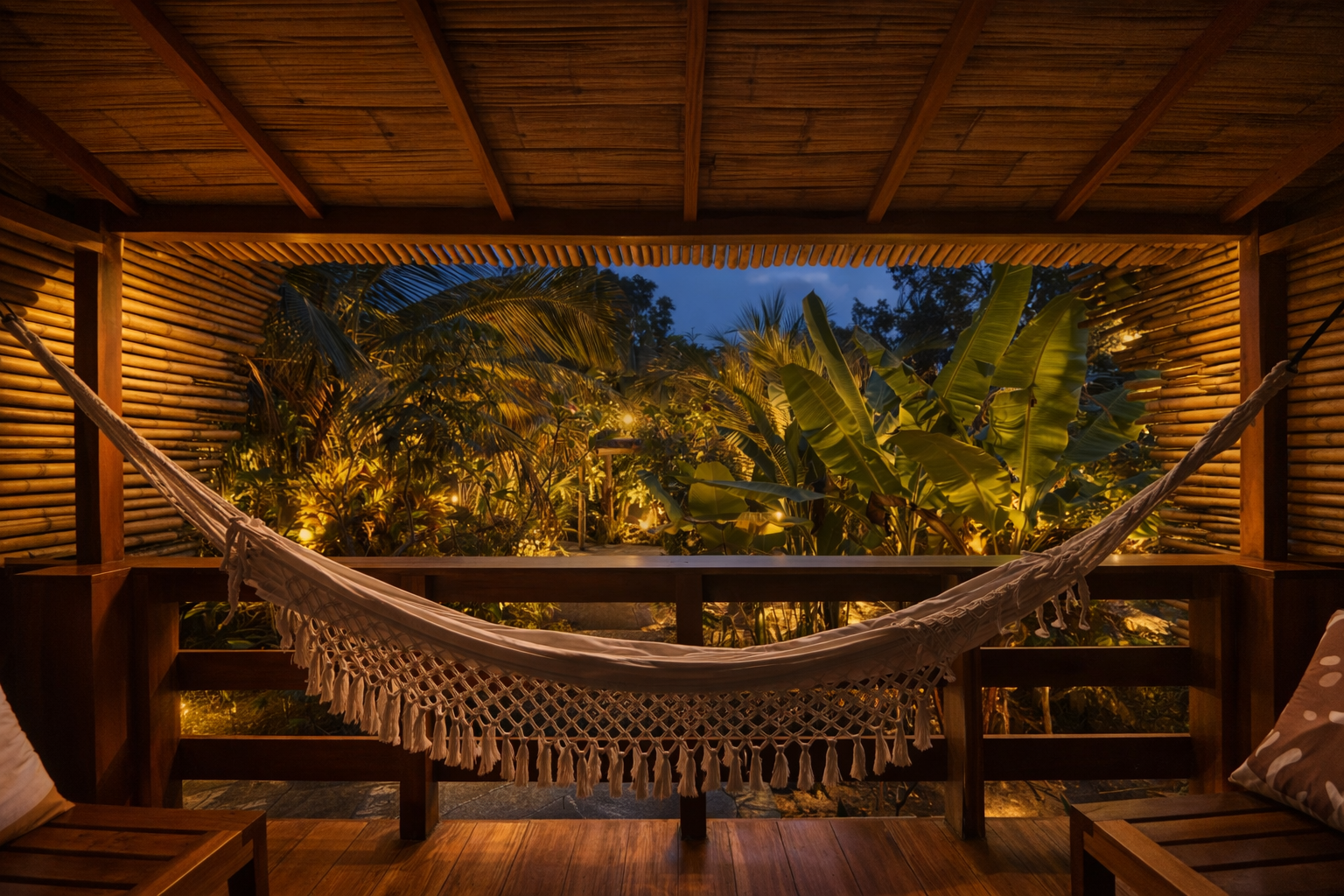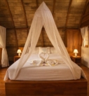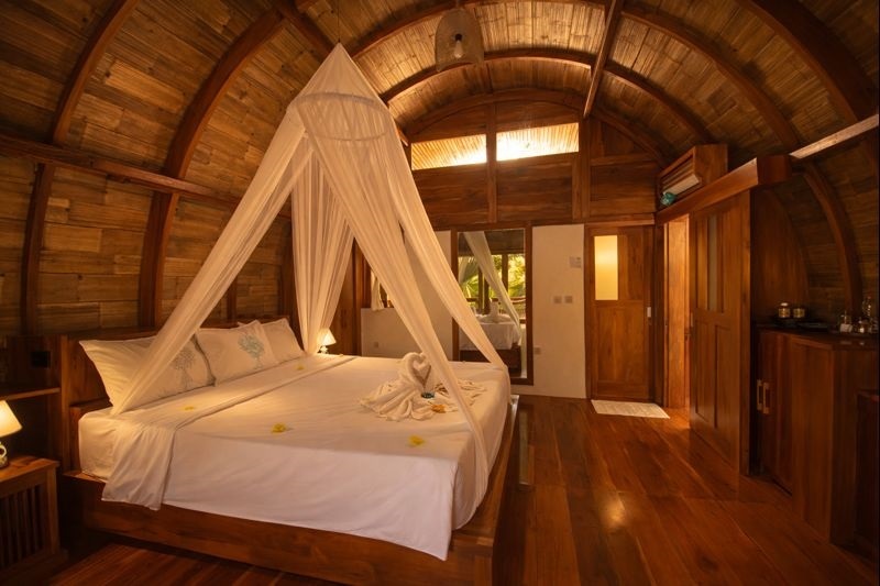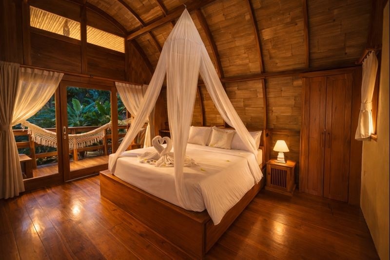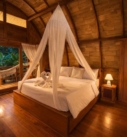 With its open-air concept and adjustable bamboo blinds, the bungalow invites fresh breezes, soft natural light, and calming garden views throughout the day. A gentle freshwater stream flows nearby, enhancing the soothing atmosphere. As evening arrives, enjoy the enchanting glow of fireflies before drifting into rest, and wake up to crisp mornings filled with the melodic songs of tropical birds.