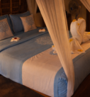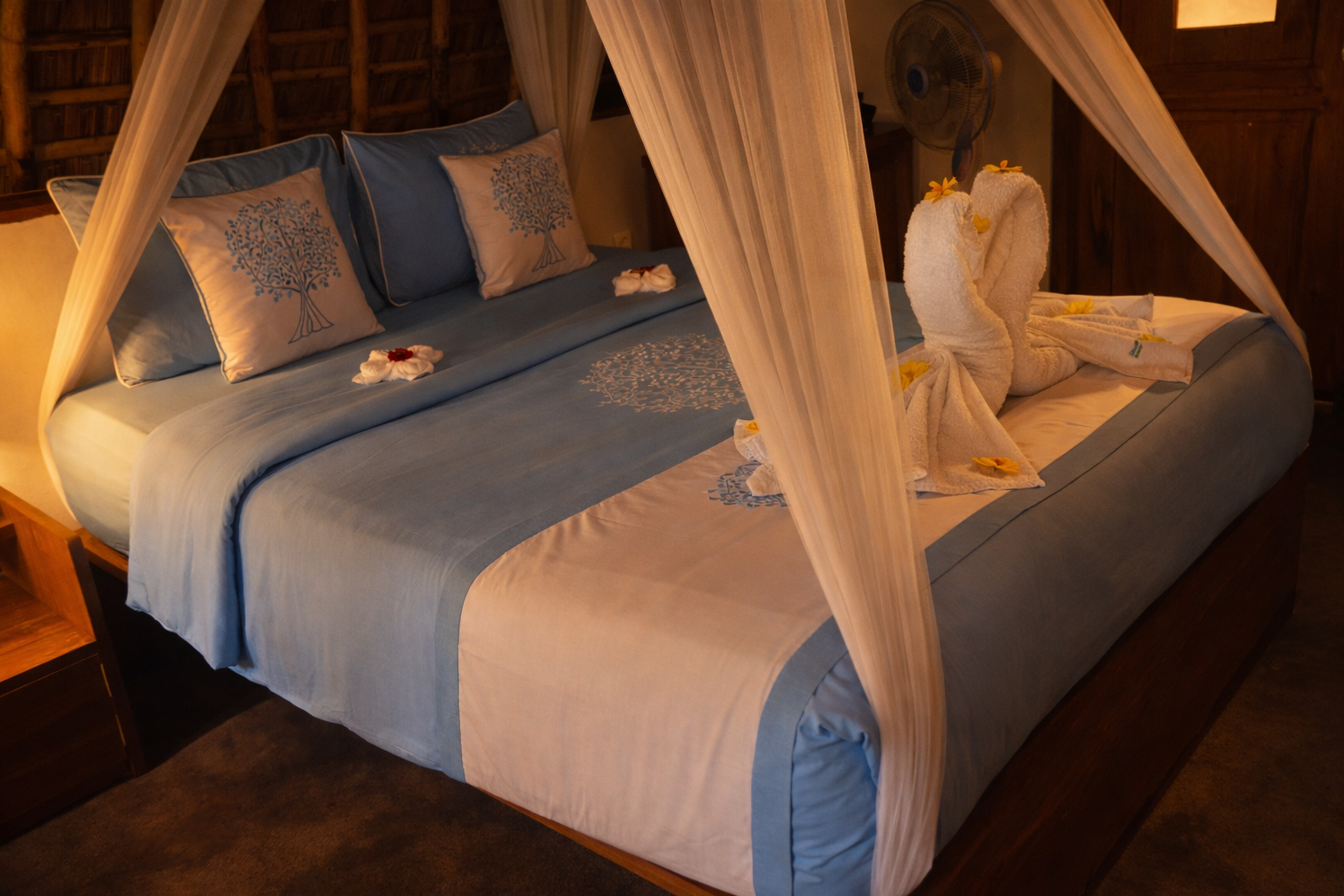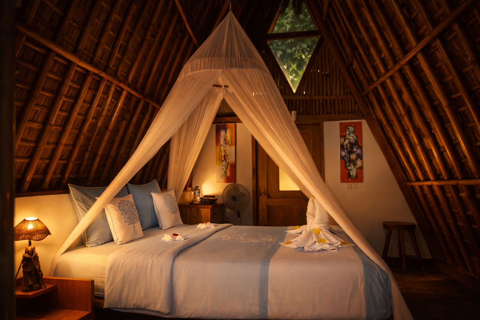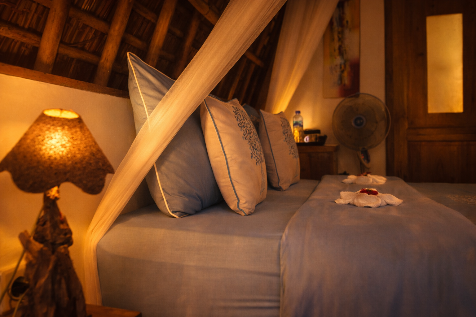 The bungalow features a comfortable queen size bed draped with a spacious mosquito net, allowing fresh natural air to flow freely while ensuring a restful night’s sleep. Its thoughtful design creates a bright, airy space that feels both cozy and open.