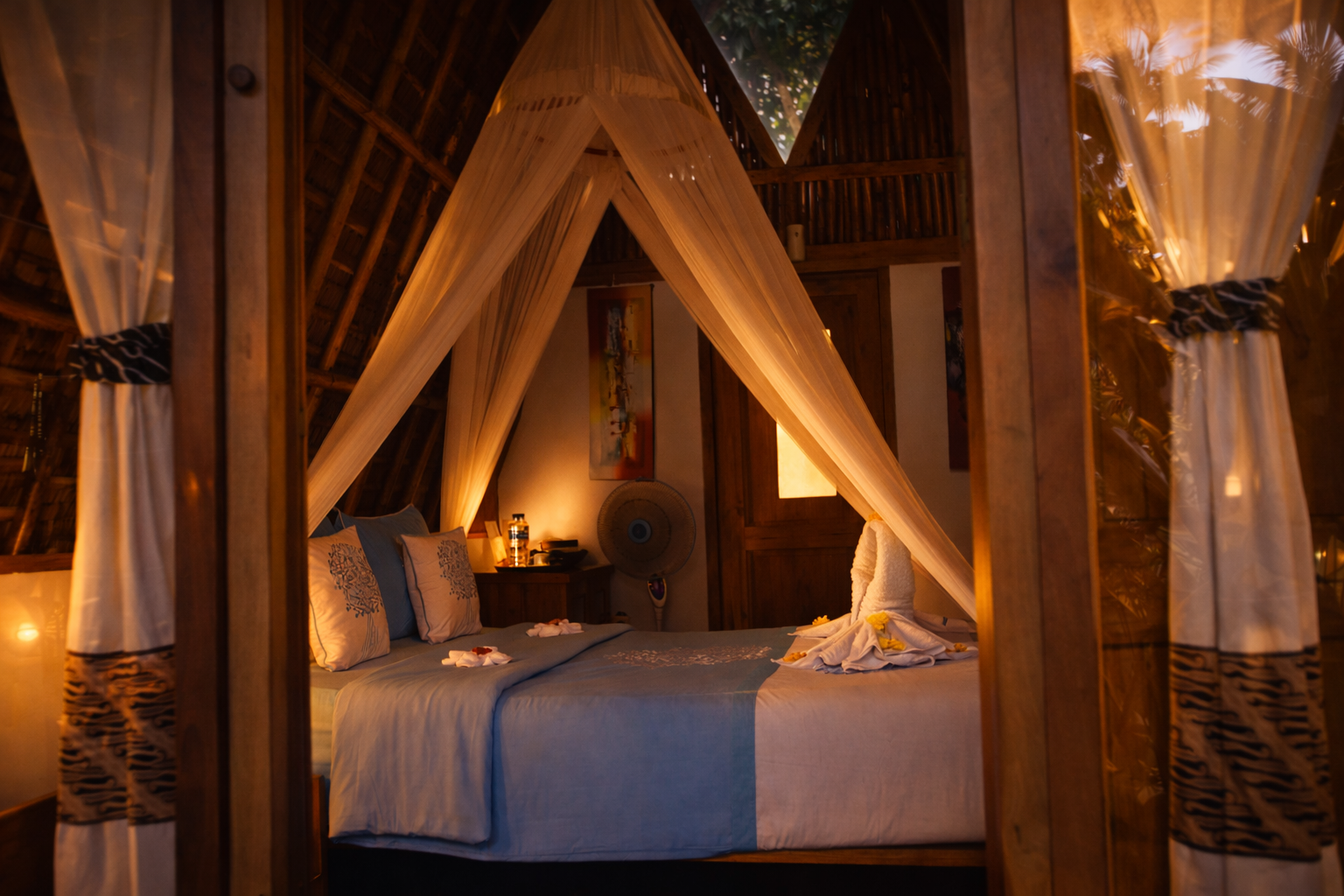 With its open-air concept and adjustable bamboo blinds, the Rengkong Bungalow immerses you in the natural surroundings. A gentle freshwater stream nearby, clear sky views, and the enchanting glow of fireflies at night create a magical setting. Wake each morning to the soft songs of tropical birds, feeling refreshed, relaxed, and perfectly at ease.